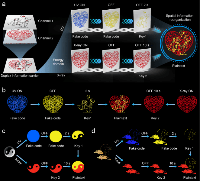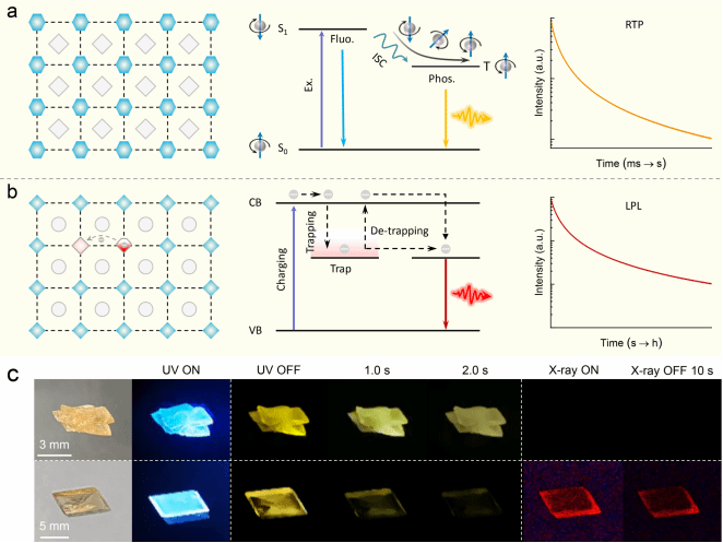 随着数字技术的飞速发展,人类社会正逐步迈入“超连接”时代。与此同时,信息安全问题正面临前所未有的挑战。传统的光学加密方法因易被复制或伪造,难以满足日益增长的安全需求。近年来,时间分辨光学加密技术因其能够在时间维度上编码信息而受到广泛关注。其中,具有可调发光寿命的发光材料,特别是余辉时间超过毫秒级的材料,可实现肉眼可辨的动态信息识别,为多级信息加密提供了新的思路。目前用于光学加密的发光材料主要分为两类:室温磷光材料和长余辉发光材料。室温磷光通常来源于有机分子中单重态至三重态的自旋禁阻跃迁,可通过构建刚性分子环境实现。长余辉发光材料多为无机体系,其发光依赖于陷阱调控的载流子复合机制,可实现持续数秒甚至更长的余辉。然而,单一的发光机制通常导致材料的光谱与寿命特征固定,限制了信息编码的复杂度。