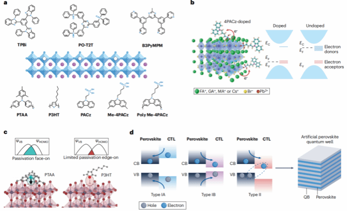 除了钝化缺陷和促进空穴注入,在钙钛矿薄膜中加入4PACz可以有效地将钙钛矿费米能级从导带附近转移到价带附近,实现可调的n型和p型行为,而不影响钙钛矿的光学性质。钙钛矿表面也可能影响有机HTLs的分子堆积构型。由于更接近钙钛矿表面,“正面”分子取向促进更有效的电荷转移,而“侧面”结构可能导致与钙钛矿的相互作用减弱,降低电荷传输能力。以上结果表明,本身作为电荷传输层(CTL)或界面层使用的路易斯碱分子具有多重功能,超越了传统电荷注入/提取的范畴。