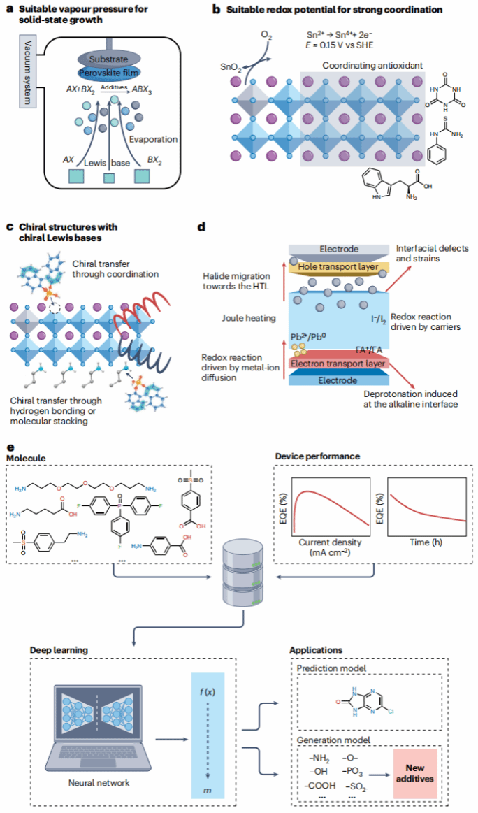分子工程,尤其是路易斯碱性基团的引入,已成为提升钙钛矿发光二极管(PeLED)效率和稳定性的核心策略之一。尽管已取得重大进展,分子添加剂的选择仍多凭经验,这很大程度上源于对其结构如何决定功能的理解尚不全面。本综述重点关注揭示钙钛矿发光二极管中分子添加剂工作机制的最新进展,并强调其与钙钛矿光伏器件中分子添加剂在结构与功能需求上的本质差异。作者首先探讨了添加剂与钙钛矿前驱体之间化学相互作用及反应的关键作用;随后从分子设计的角度,系统讨论了添加剂的多种效应与功能,包括缺陷工程、结晶调控以及对化学无序的影响。最后,文章概述了面向稳定性提升与合理分子设计的未来研究方向,并展望了将路易斯碱性添加剂拓展至钙钛矿型无铅及自旋极化发射器的应用前景。